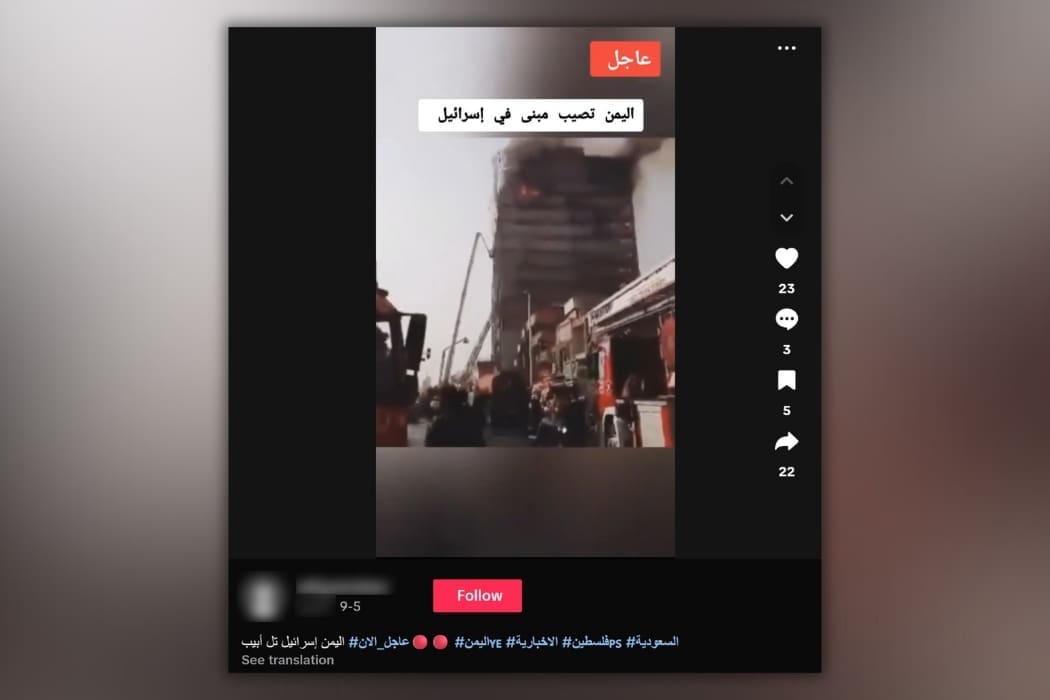 هذا المقطع لا يصور إصابة مبنى في تل أبيب بصاروخ يمني، بل يعود لحريق في مبنى شاهق في طهران في يناير 2017
