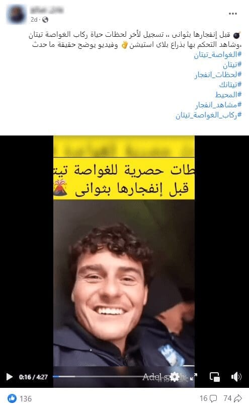 إثر ذلك تداول ناشطون على موقع الفيسبوك مقطع فيديو يدعون أنه يظهر اللحظات الأخيرة لطاقم الغواصة تيتان قبل انفجارها،