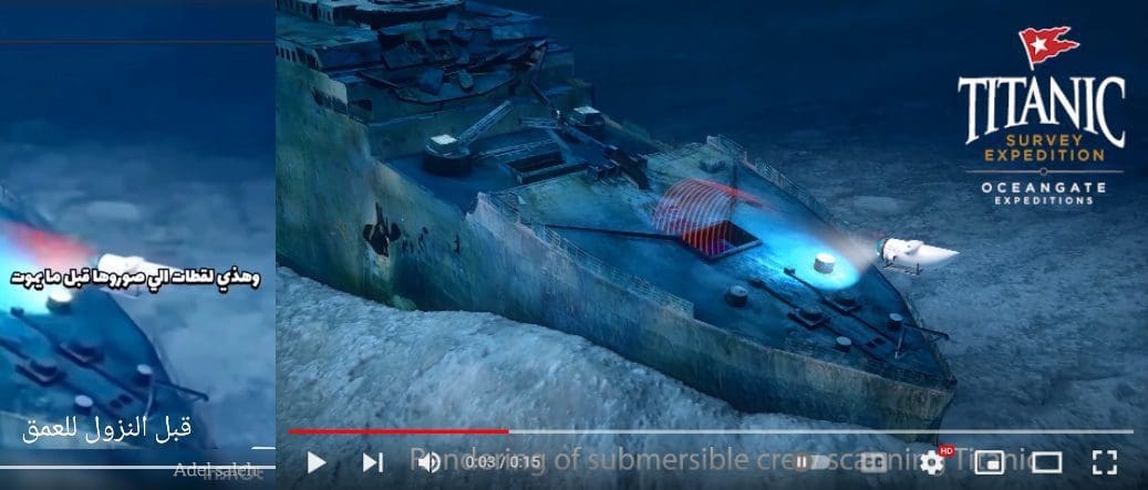 كما وقع الفريق على مقطع آخر في ذات القناة، يبين محاكاة حاسوبية لعملية مسح الغواصة تيتان لسفينة تيتانيك منشورًا بتاريخ 20 يناير 2021.