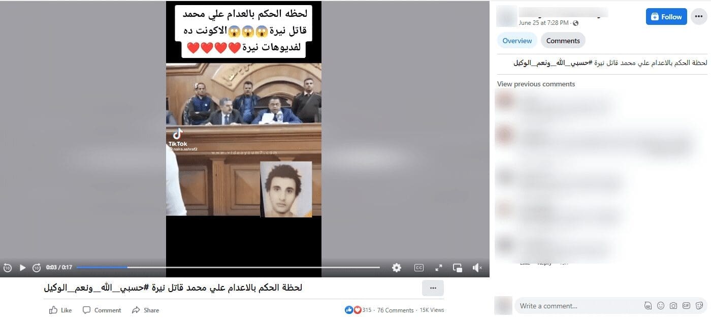 إثر ذلك تداول ناشطون على فيسبوك مقطعًا يزعمون أنه يظهر لحظة النطق بحكم الإعدام بحق قاتل الطالبة نيرة أشرف،