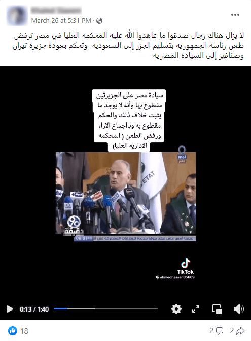تناقل ناشطون فيسبوك مقطع فيديو يدّعي ناشروه أنه يبين حكم المحكمة العليا في مصر حديثًا بعودة جزيرتي تيران وصنافير إلى السيادة المصرية،