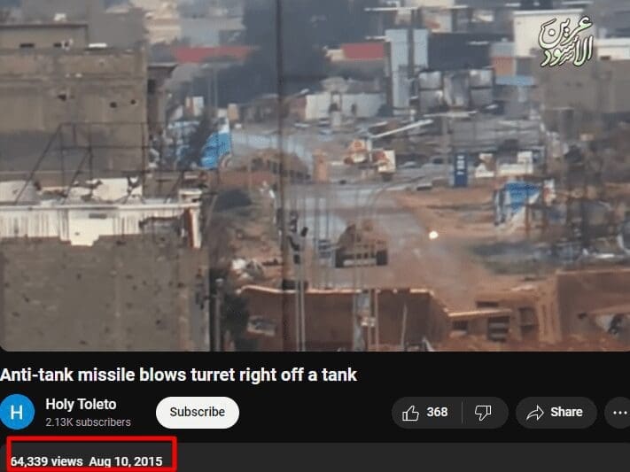 ضمن مقطع مطول بتاريخ 10 أغسطس 2015، على أنه يظهر استهداف دبابة من قبل صاروخ مضاد للدبابات في ليبيا.
