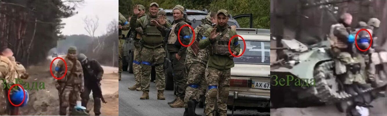فيما يمكن مطابقة الزي الوارد في هذا المقطع مع الزي العسكري في أوكرانيا (الصورة في المنتصف)، في الصورة الآتية،