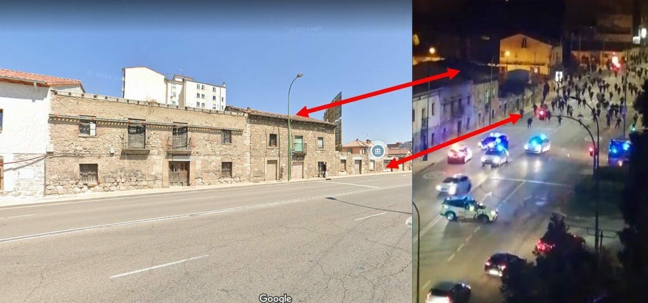 فيما يمكن مطابقة معالم المنطقة الظاهرة في مقطع الادعاء، مع صور خرائط جوجل لأحد شوارع بورجوس في إسبانيا في الصورة الآتية.