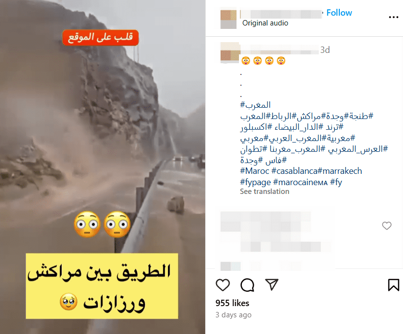 في أعقاب ذلك، تناقل ناشطون على منصات التواصل مقطعاً يدعون أنه يظهر فيضانات على الطريق بين مراكش وورزازات حديثاً،