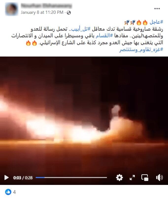 نقلًا عن وكالة بي بي سي -دون تصرف-: “قالت كتائب القسام -الجناح العسكري لحركة حماس- إنها أطلقت رشقة صاروخية على مدينة تل أبيب، رداً على ما وصفته “المجازر الإسرائيلية بحق المدنيين في قطاع غزة”.” إثر ذلك تداول ناشطون على الفيسبوك مقطع فيديو يدعون أنه يظهر لحظة إطلاق رشقة صاروخية تجاه تل أبيب،