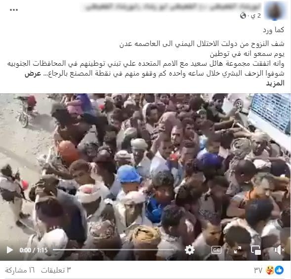 هذا المقطع يصور التهجير القسري “للشماليين” في عدن عام 2019، ولا تصور نزوح مواطنين يمنيين إلى عدن مؤخرًا.