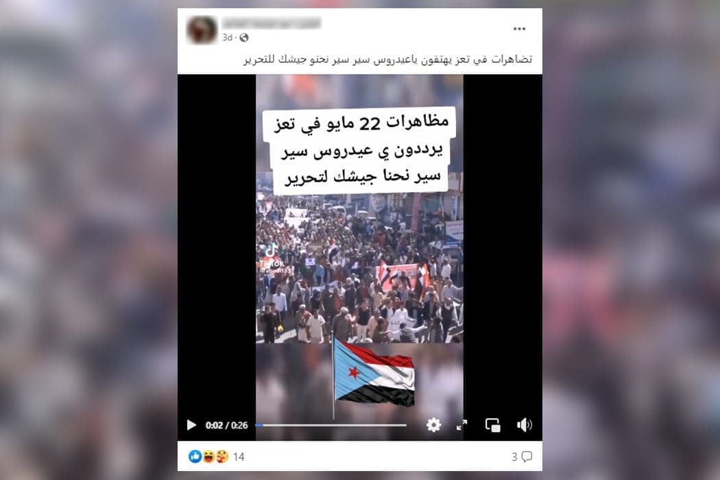 تناقل بعض الناشطين على الفيسبوك مقطع فيديو يدّعي ناشروه أنه يظهر مظاهرات في تعز لدعم عيدروس الزبيدي.