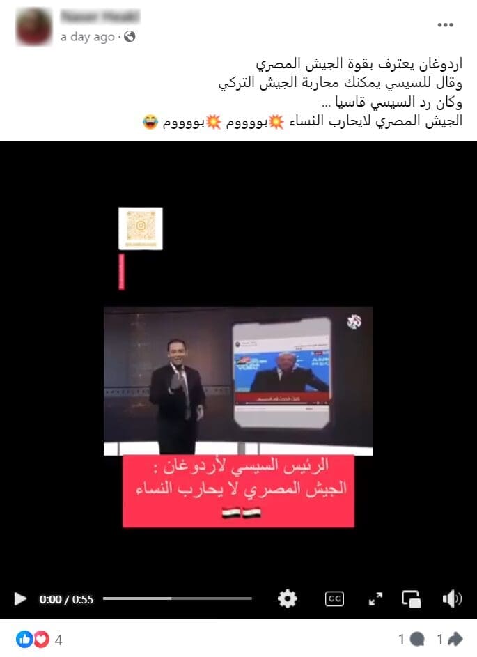 هذا المقطع مجتزأ من سياقه، ويظهر مذيعًا ينفي خبرًا لتصريح أردوغان بأنّ السيسي أهان الجيش التركي
