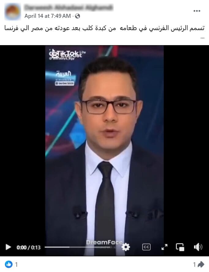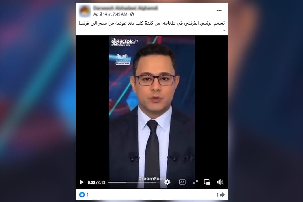 هذا المقطع مفبرك باستخدام إحدى أدوات التزييف العميق، ولا صحة لإصابة ماكرون بالتسمم جراء تناوله الطعام في مصر مؤخرًا