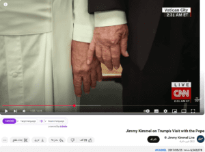 كما كشف البحث نفسه أن الفيديو المفبرك كان قد نشر لأول مرة خلال إحدى حلقات برنامج Jimmy Kimmel Live التي عرضت في 25 مايو 2017، وهو برنامج حواري كوميدي يقدمه الإعلامي جيمي كيميل، وبحسب صحيفة ذي إندبندنت البريطانية، في هذه المشاهد (سخر الإعلامي كيميل من اللقطات الأخيرة التي بدا فيها أن السيدة الأولى ميلانيا ترامب تدفع يد زوجها بعيدًا عندما حاول إمساك يدها، فعرض مقطعًا ساخرًا يصور نفس الموقف ولكن هذه المرة بين الرئيس والبابا).