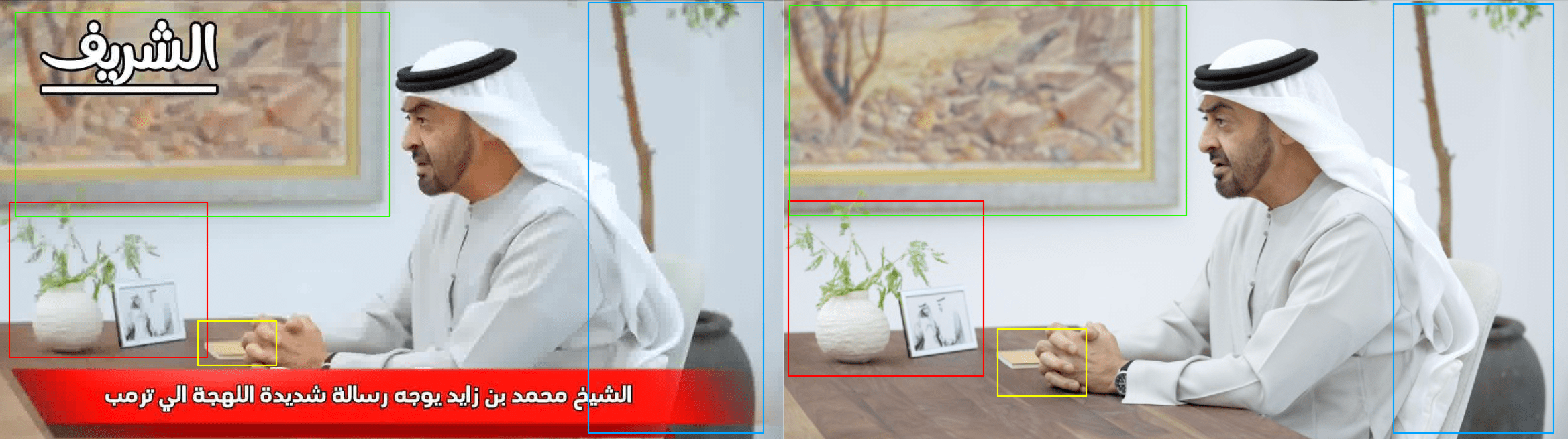 مطابقة بين الصورة المرفقة بتقرير وكالة الأنباء الإماراتية (يمين) مع لقطة ثابتة من مقطع الادعاء (يسار)