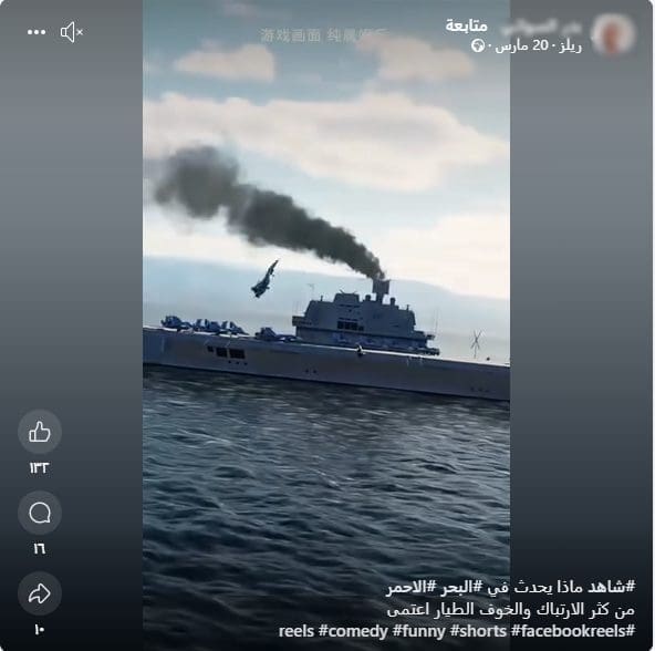 هذا المقطع غير حقيقي، ومقتبس من لعبة المحاكاة الإلكترونية DCS، ولا يصور مشاهد من الأحداث الجارية في البحر الأحمر مؤخرًا