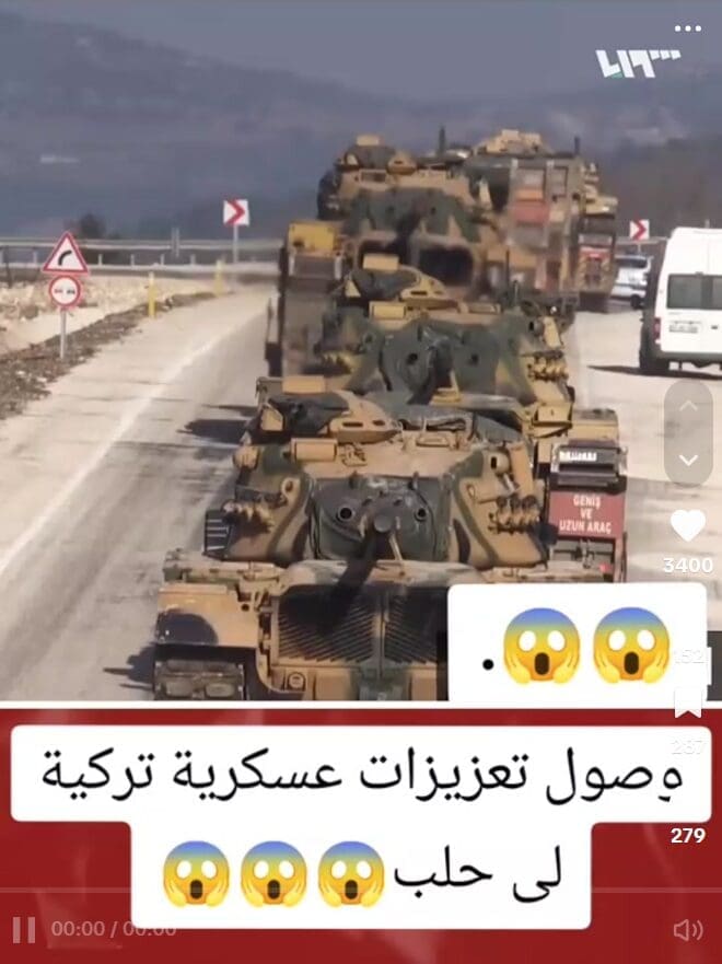 في هذا السياق، تداول ناشطون على تيكتوك مقطعًا يدعون أنه يظهر وصول تعزيزات تركية إلى مدينة حلب مؤخرا،