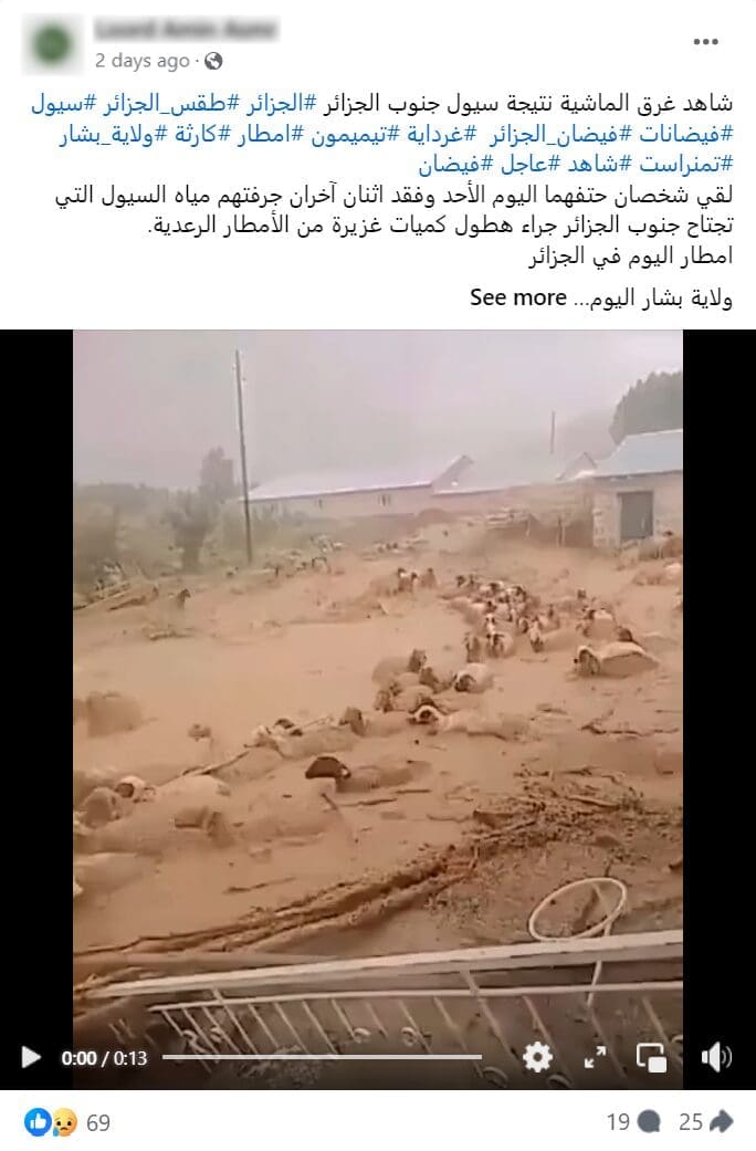 إثر ذلك تداول ناشطون على الفيسبوك مقطعًا يدعون أنه يظهر غرق الماشية نتيجة السيول في جنوب الجزائر،