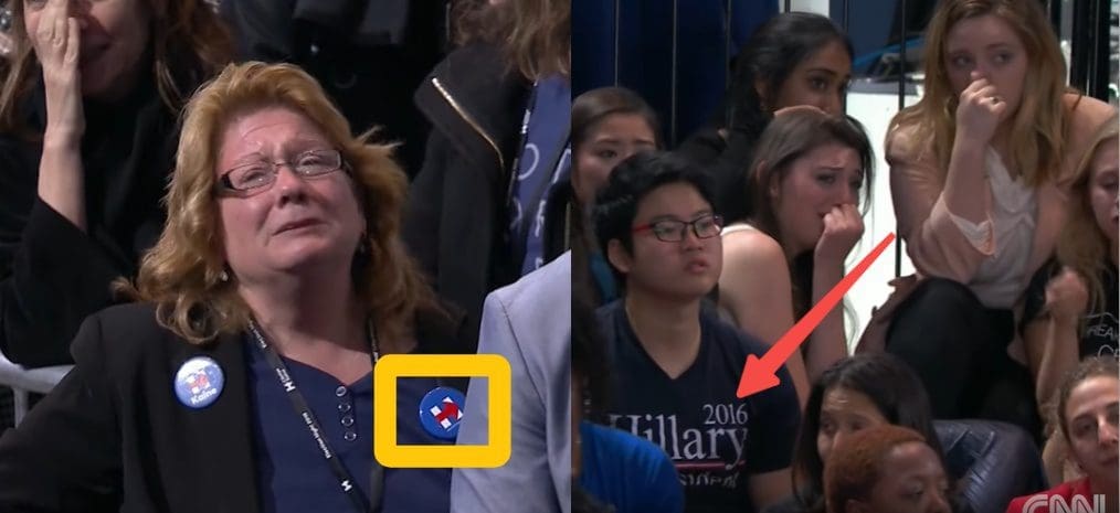 علاوة على ذلك؛ يمكن ملاحظة ما كُتب على قميص أحد الحاضرين آنذاك “2016 Hillary“، كذلك شعار حملة هيلاري الانتخابية عام 2016 الذي ترتديه إحدى الحاضرات في المقطع.