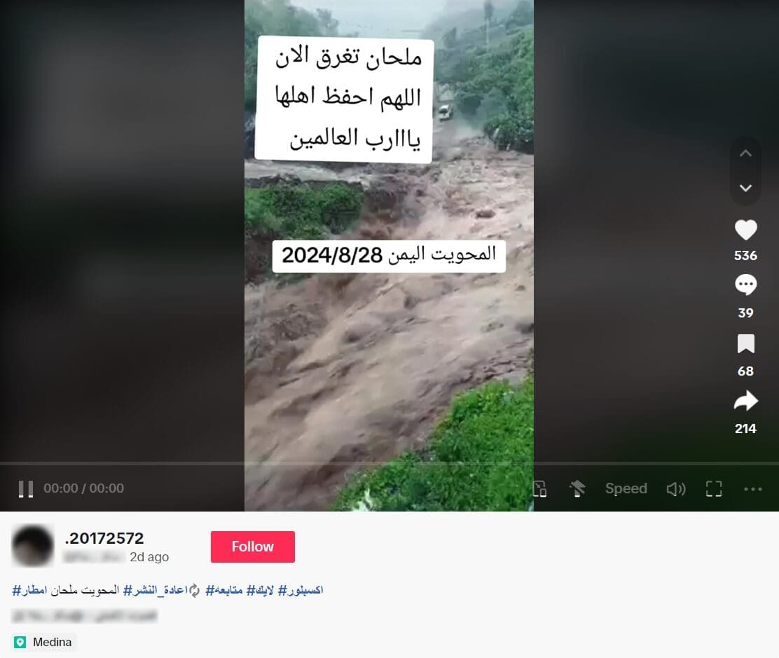 إثر ذلك تداول ناشطون على تيكتوك مقطع فيديو يدعون أنه يظهر مشاهد من هذه السيول في محافظة المحويت،