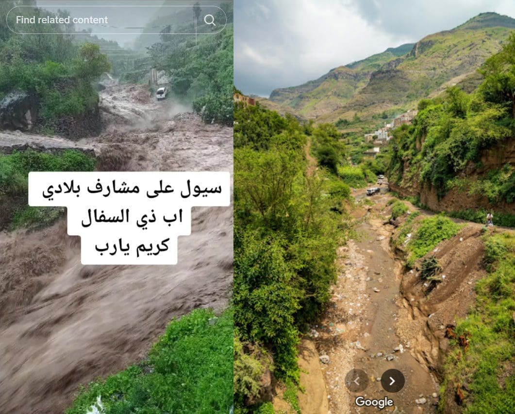 أشار أحد مستخدمي منصة تيكتوك في تعليقه على المقطع أنه يصوّر سيلًا في وادي العنبي محافظة إب مديرية ذي السفال،