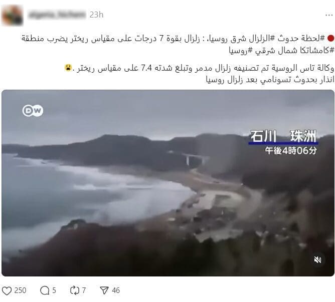 هذا المقطع يصوّر مشاهد من زلزال ضرب اليابان في يناير 2024، وليس من الزلزال الذي ضرب قرب كامتشاتكا الروسية مؤخرًا