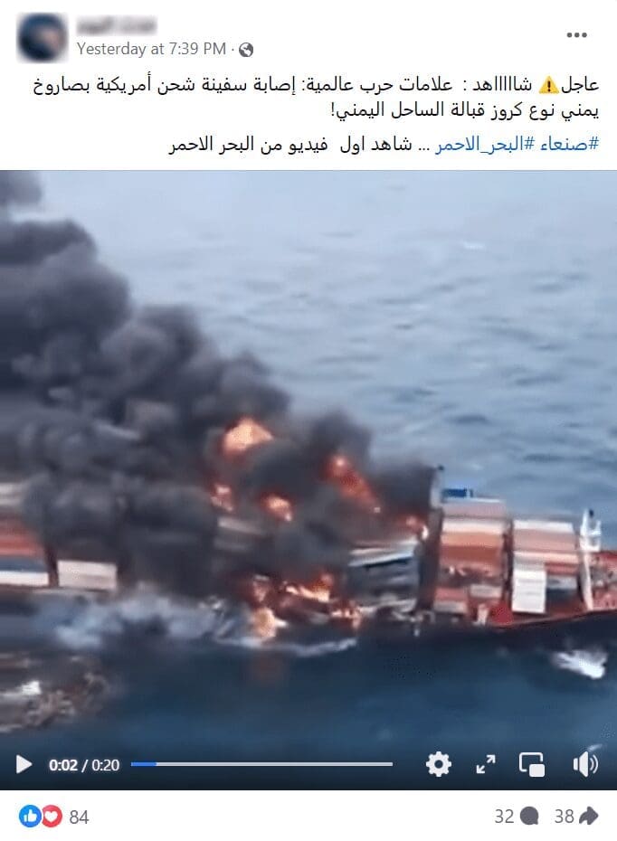 إثر ذلك تداول ناشطون على الفيسبوك مقطع فيديو يدعون أنه يظهر إصابة سفينة شحن أمريكية في البحر الأحمر بصاروخ أطلقه الحوثيون،