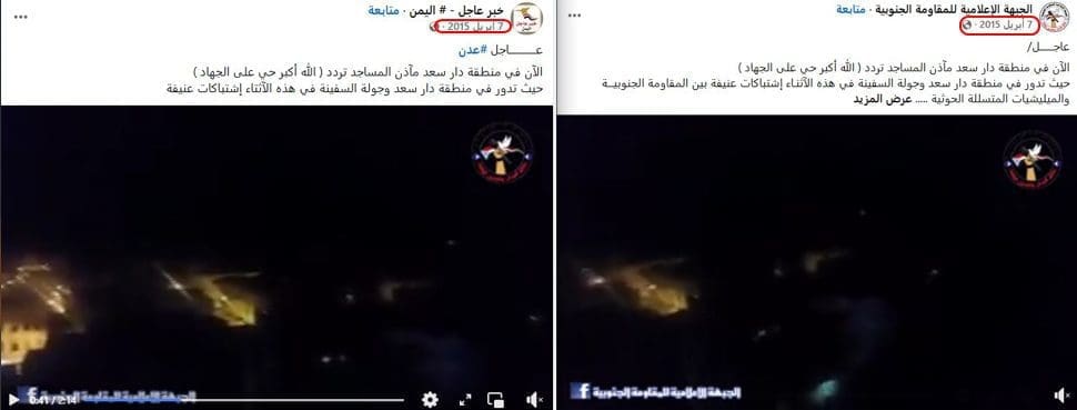 إلى ذلك؛ قاد البحث بالكلمات الدلالية في محرك البحث جوجل إلى منصة فيسبوك، إذ نشرت إحدى الصفحات على المنصة المقطع ذاته بتاريخ 7 أبريل 2015، على أنه يظهر دعوات للجهاد أطلقتها مآذن المساجد في منطقة دار سعد في عدن آنذاك.