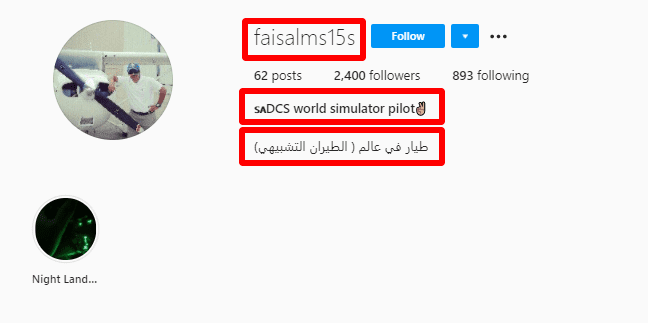 وكتب في وصف الحساب: “DCS world simulator pilot - طيار في عالم ( الطيران التشبيهي)”