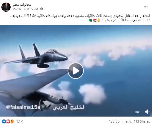 انتشر على مواقع التواصل الاجتماعي فيسبوك وتويتر مقطع فيديو يزعم ناشروه أنه يظهر طائرة لمقاتل سعودي يسقط ثلاث طائرات مسيره