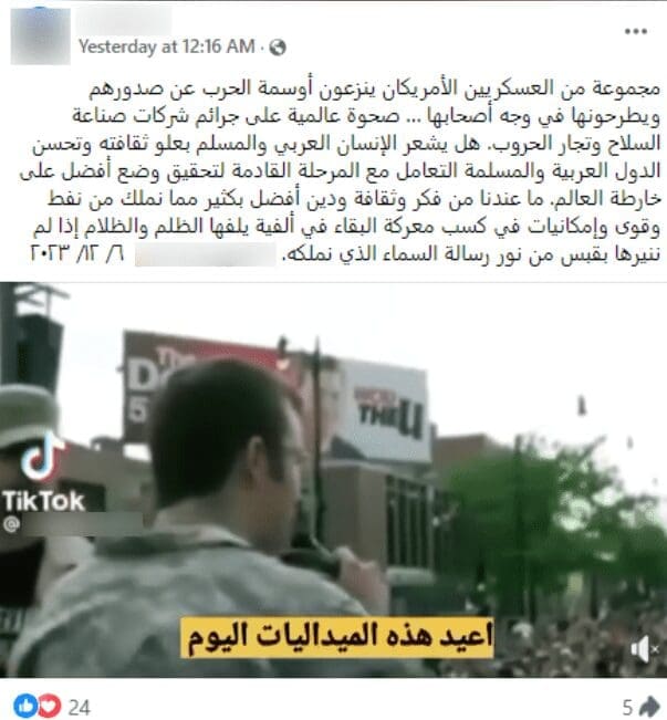 في هذا السياق تداول ناشطون على فيسبوك مقطعاً يدعون أنه لعسكريين أمريكيين قاموا بنزع أوسمتهم مؤخراً،