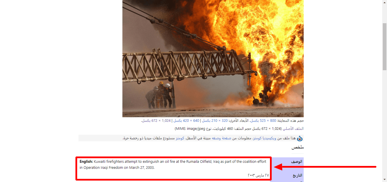 وفي وصف الصورة كٌتب بأنها تعود لفريق اطفاء كويتي اثناء محاولة اخماد حريق في حقل الرميلة عام 2003.