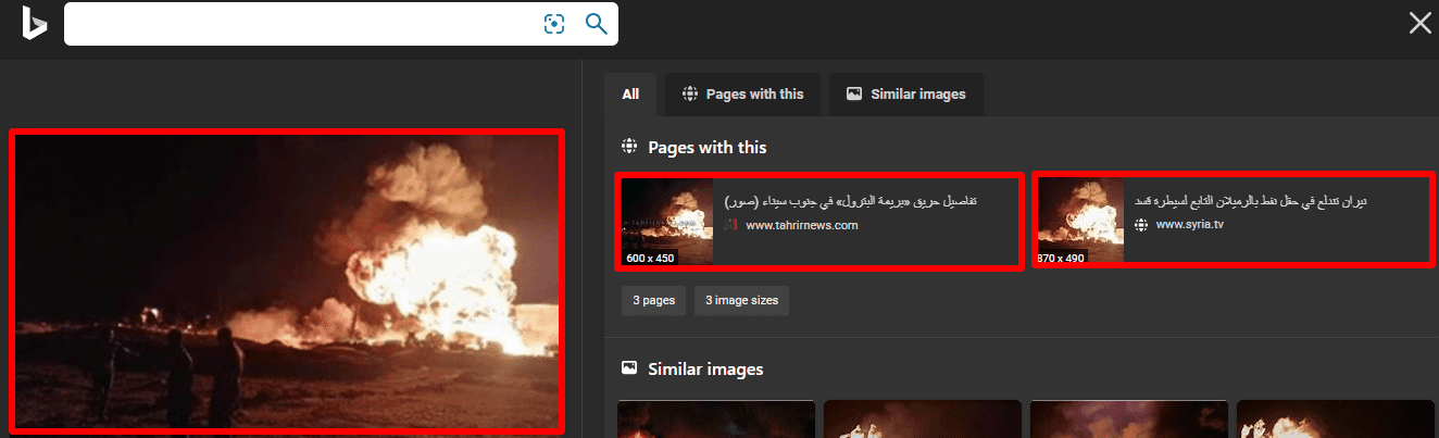 عند البحث عن الصورة الثالثة في محرك بحث bing عثرنا على صورة الادعاء ذاتها كان قد نشرها موقع tahrirnews.com تحت عنوان حريق «بريمة البترول» في جنوب سيناء بتاريخ 2018/12/14