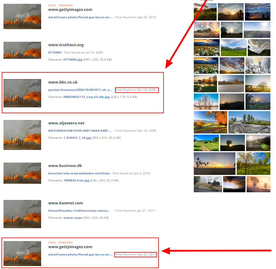 وكان موقع بي بي سي قد نشر الصورة في عام 2009 وقال بأنها في العراق، فيما قال موقع gettyimages بأن الصورة لحريق في حقل نفط كركوك العراقية عام 2009.