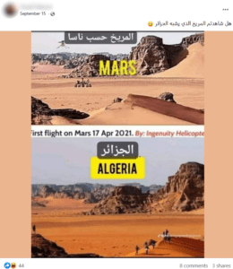 تناقل ناشطون على فيسبوك صورة يدعون أن ناسا نشرتها على أنها من المريخ، مقارنة مع صورة مشابهة لها من الصحراء الجزائرية في إشارة إلى أن الصور التي تنشرها محطة الفضاء الدولية على أنها من المريخ غير صحيحة،