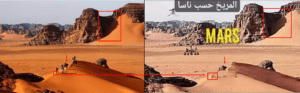 فيما تبين أن صورة الادعاء المنسوبة لناسا على أنها تظهر المريخ ما هي إلا تعديل للصورة الأصلية لصحراء الجزائر، إذ من خلال مقارنة الصورتين يمكن ملاحظة التطابق التام بين الصورتين (الصخور، الظلال، الرمال)،