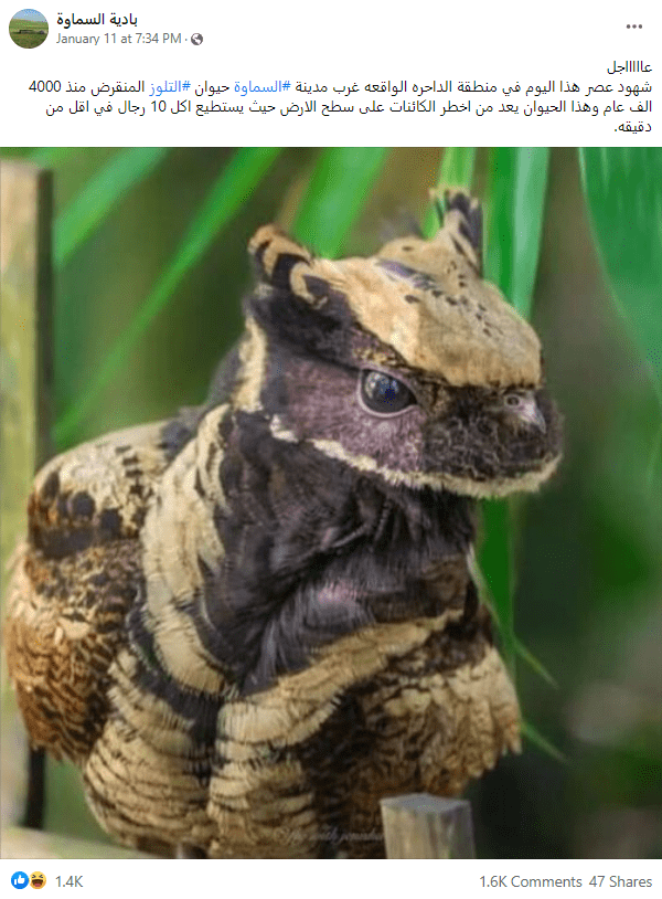 تناقل روّاد مواقع التواصل الاجتماعي خبرًا يزعم ناشروه أن حيوانًا منقرضًا عاد للظهور مجدّدًا، خطيرٌ لدرجة أنه يأكل عشرة رجال بأقل من دقيقة،