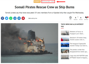 إذ نشرها موقع Sea news التركي في 19 يونيو 2011، ضمن تقرير حول اشتعال النيران في سفينة الشحن MV Orna التي ترفع علم بنما في معقل القراصنة في هراردير على ساحل المحيط الهندي في الصومال،