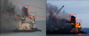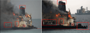 إلا أن البحث ذاته قاد لصورة مطابقة منشورة عبر منصة flickr في يونيو 2010 على أنها تظهر اشتعال النيران في حطام السفينة Seli 1 قرب كيب تاون، جنوب أفريقيا.