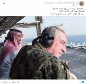 في أعقاب ذلك، تناقل ناشطون على فيسبوك صورة يدعون أنها تبين ظهور محمد بن سلمان على متن حاملة طائرات أمريكية في البحر الأحمر حديثًا،