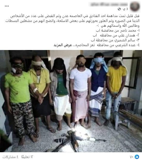 هذه الصورة قديمة منذ عام 2020، وتعود لإلقاء القبض على أشخاص في حي الكراع شمالي عدن آنذاك، وليس حديثًا