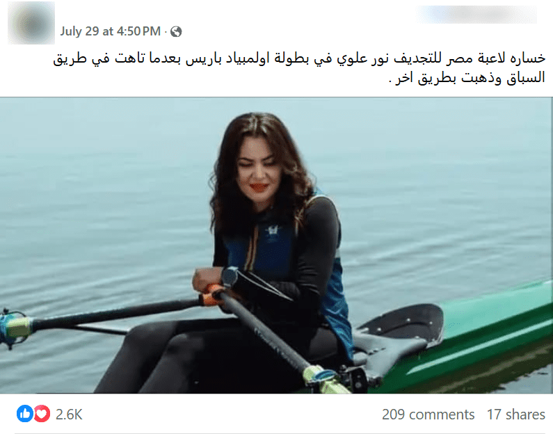 نشرت إحدى صفحات فيسبوك الادعاء بتاريخ 29 يوليو 2024 على أنه للاعبة تدعى “نور علوي”، محققاً أكثر من 2.6 ألف تفاعل،