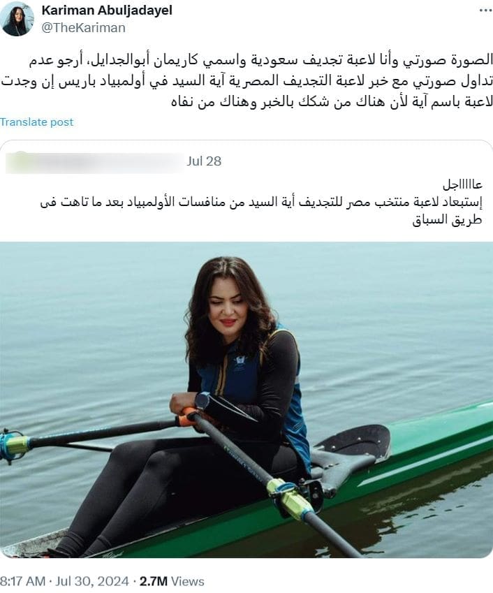 وبيّنت أن الصورة تعود لها، وهي لاعبة تجديف سعودية، نافية أن تكون الصورة للاعبة تجديفٍ مصرية في أولمبياد باريس تدعى آية السيد.