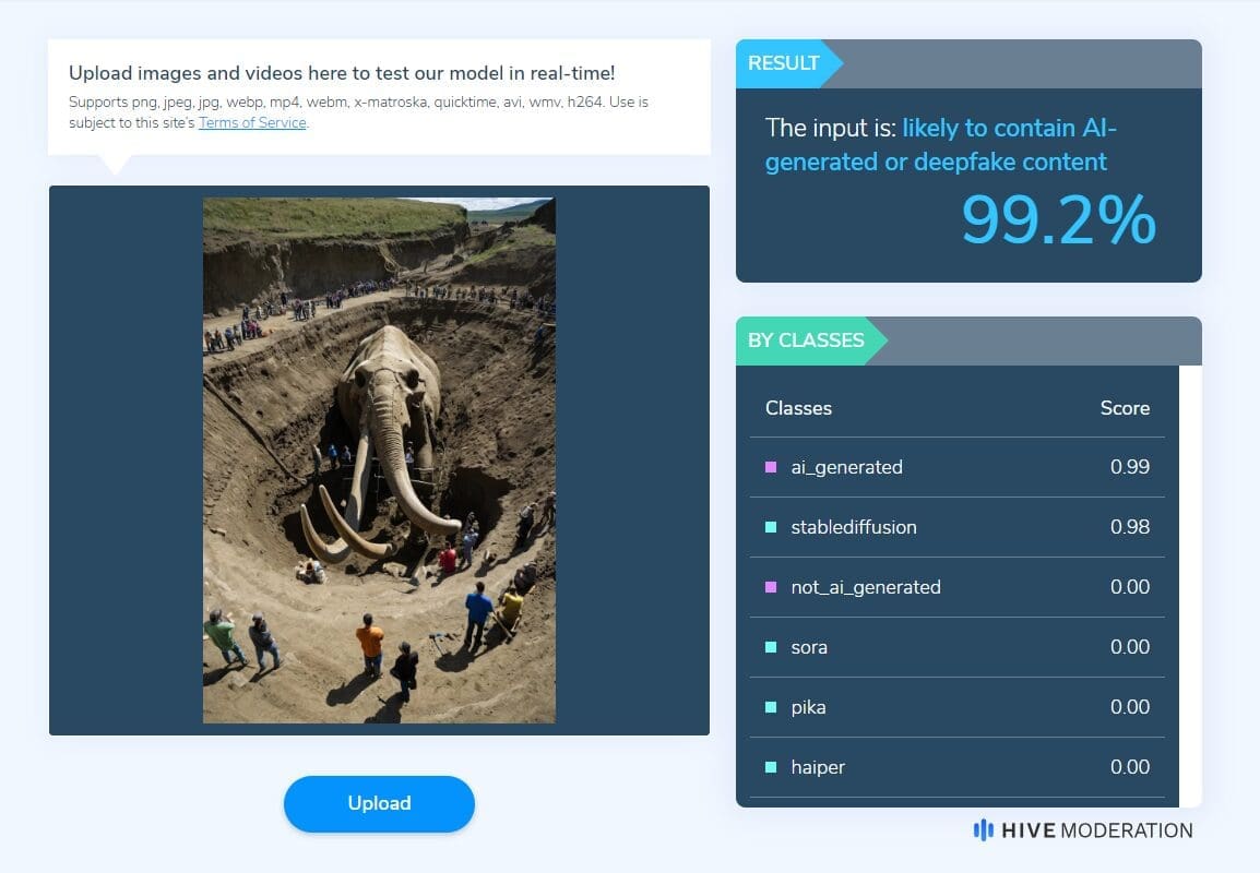 وبفحص الصورة بإحدى الأدوات المخصصة للكشف عن الصور وليدة الذكاء الاصطناعي، تبيّن أنها كذلك بنسبة تفوق 99%، كما يلي.