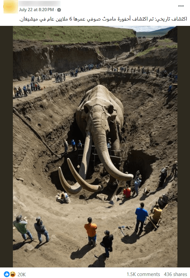 هذه الصورة غير حقيقية وليست لاكتشاف أحفورة ماموث تعود لستة ملايين عامٍ، بل هي من نتاج الذكاء الاصطناعي