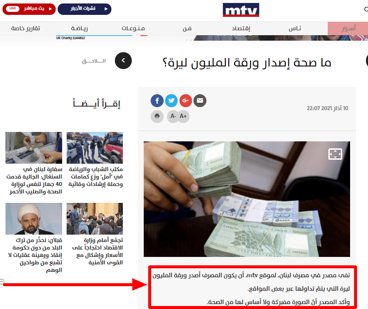 عثر فريق منصة فتبينوا على خبر كان قد نشره موقع MTV اللبنانية الذي تواصل مع مصرف لبنان،