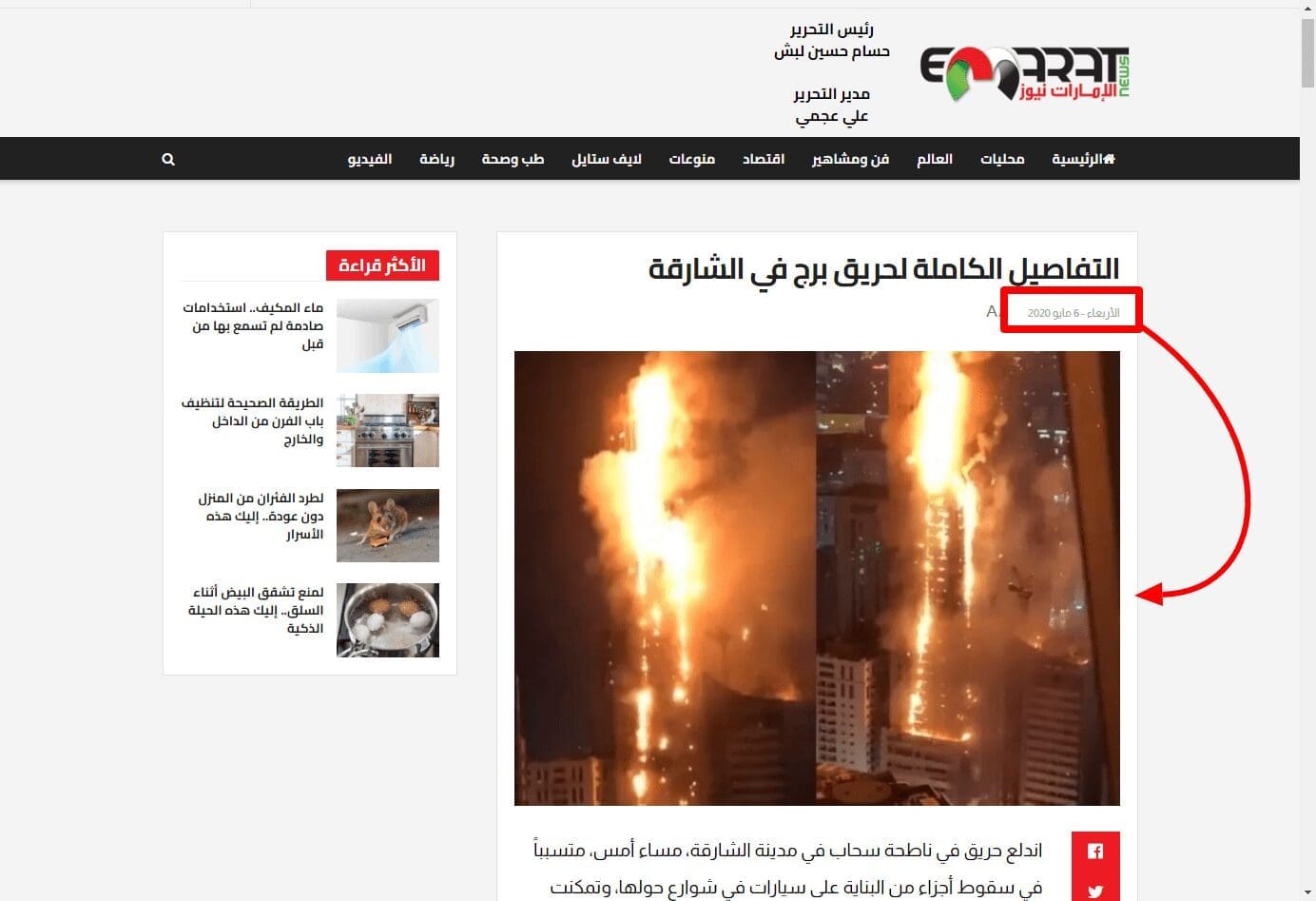 حيث نشرتها صحيفة الإمارات نيوز بتاريخ 6 مايو 2020 على أنها تظهر حريق اندلع في أحد أبراج مدينة الشارقة الإماراتية،