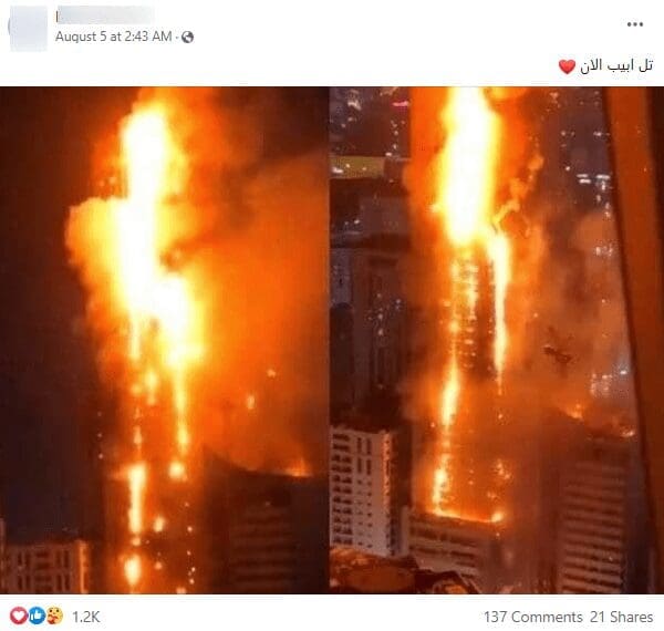 هذه الصورة قديمة وتظهر حريق في برج ابكو بمدينة الشارقة عام 2020 وليس تل ابيب