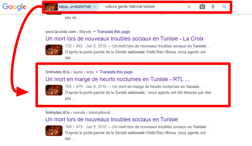 وكان موقع 5minutes.rtl.lu قد نشر صورة الادعاء ذاتها بتاريخ 09/01/2018 تحت عنوان وفاة على أثر الاشتباكات ليلية في تونس،