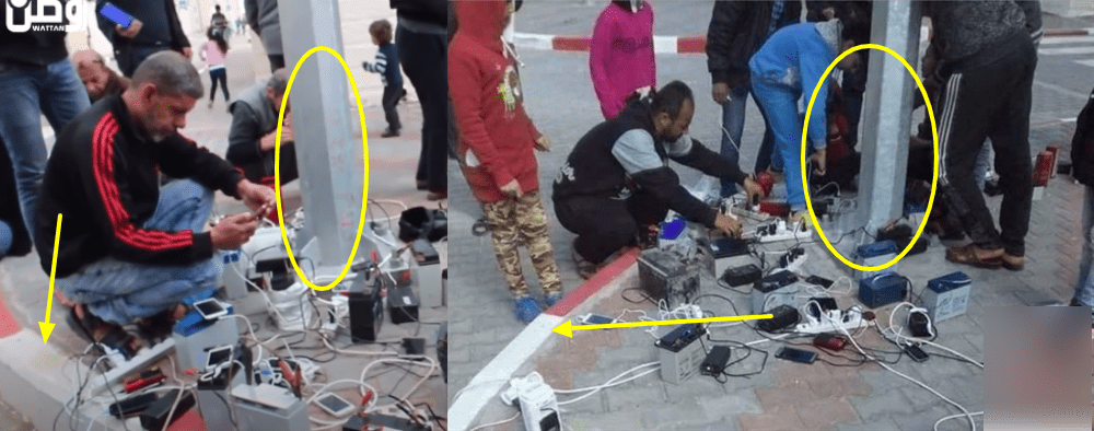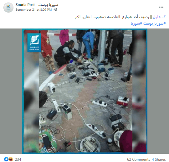 انتشرت على مواقع التواصل الاجتماعي صورة تظهر مواطنين يشحنون هواتفهم من عمود كهرباء يزعم ناشروها أنها في مدينة دمشق السورية،