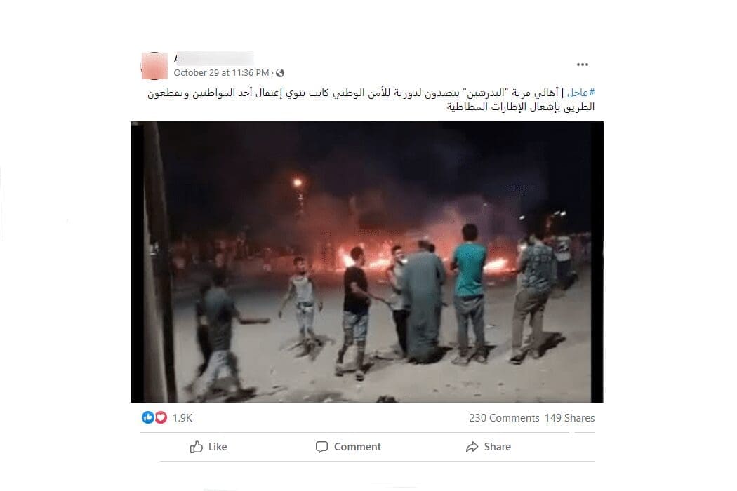 انتشرت على مواقع التواصل الاجتماعي صورة يزعم ناشروها أنها تظهر تصدي أهالي مدينة البدرشين المصرية لدورية شرطة مؤخرًا، فما حقيقة هذه الصورة؟