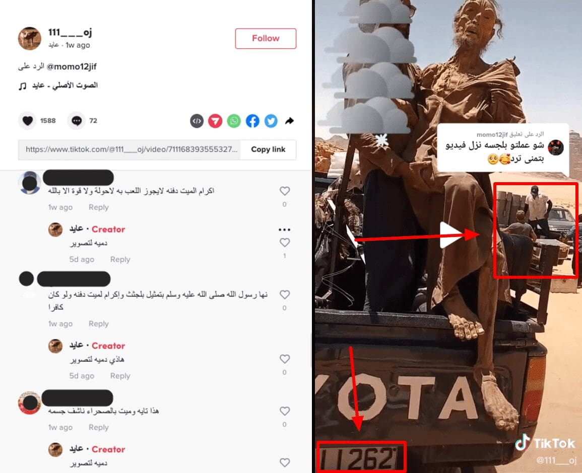كما علق ناشر المقطع على عدة تعليقات ينفي فيها أن تكون الجثة حقيقية، مؤكدا أنها دمية لتصوير فيلم،