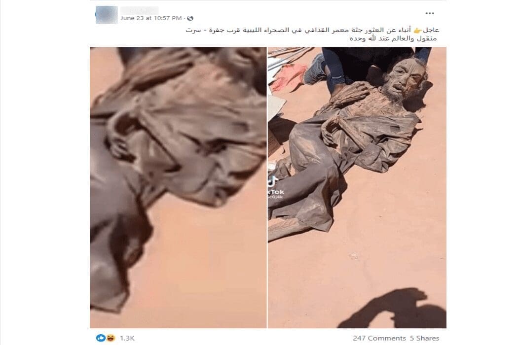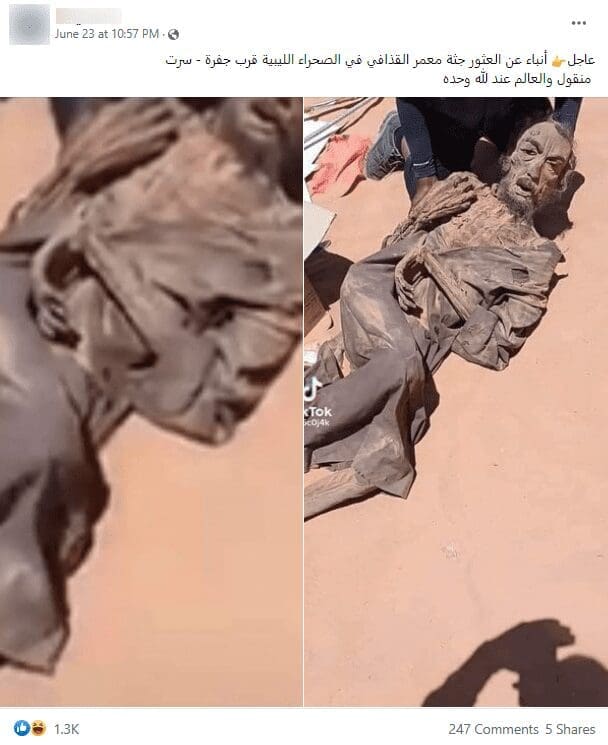 انتشرت على مواقع التواصل الاجتماعي صورة يزعمون أنها تظهر جثة معمر القذافي عثر عليها في الصحراء الليبية مؤخرًا، فما حقيقة هذه الصور؟